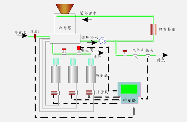加藥泵電機在交流變頻器驅動下,將藥劑注入到液體中,藥濃度被檢測儀檢測,檢測儀將與濃度成比例的電信號輸入到調節器與設定值比較,得到偏差信號,調節器將偏差信號按工藝要求進行比例、積分運算,其運算結果信號輸送給變頻器,變頻器按調節器。