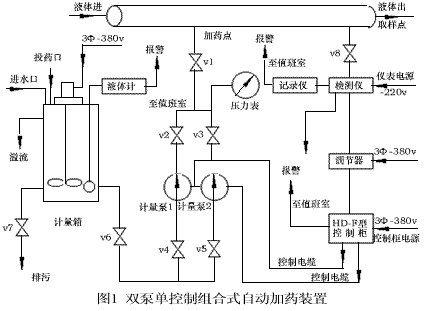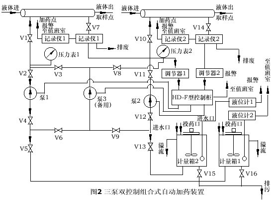雙泵單控組合式自動加藥裝置本裝置由一個計量箱、二臺計量泵(互為備用),一套交流變頻式自動加藥控制系統、連接管路、閥門、底座等組成,見圖1。計量箱的容積為1M'(用戶有特殊要求另議),是否帶攪器、遠傳液位計、液位高低限報警以及罐體材質選擇由用戶或設計部門提出,也可由用戶直接向我單位咨詢。罐體材質有鋼、不銹鋼、襯膠罐體,用于不同的藥液。用戶訂貨時,必須說明計量泵如下參數:流量(1/H),泵出口壓力(MPa),泵流路材質(或者輸送藥劑的名稱、濃度)。