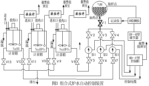 本裝置是用于鍋爐水協調磷酸鹽處理(控制爐水R值)的自動加藥裝置。該裝置由三個計量箱、三臺計量泵、一套交流變頻式R值自動控制系統、連接管路、閥門、底座等組成, 三個計量箱容積均為1立方米,分別貯存磷酸三鈉、磷酸氫二鈉、氫氧化鈉。 交流變頻式R值自動控制系統包括R值分析儀,動加藥控制柜。交流變頻式自動加藥控制柜。