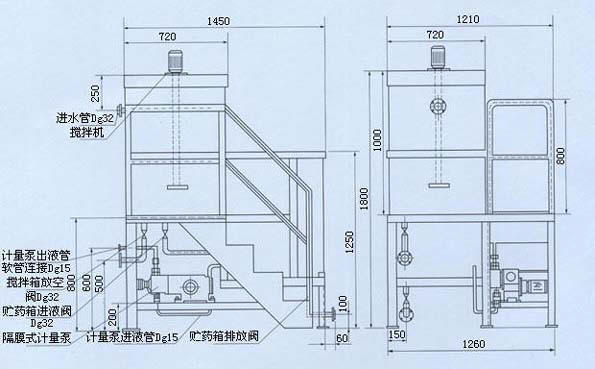 JA型加藥設備配有一個玻璃鋼材質的藥劑溶解槽,并配有一套電動攪拌機,兩個藥劑溶液槽,一套投藥裝置及配管、鋼制平臺梯子等部件組成一個整體。 |