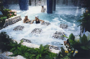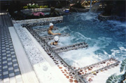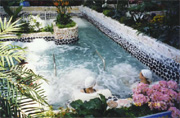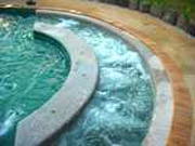 360度圓形瀑布按摩泉 利用落差形成的圓形瀑布,進(jìn)行身體之淋浴刺激,沖擊頭、頸、肩等部位柔池性按摩,并促進(jìn)血液循環(huán)。消除耳嗚,偏頭痛,松馳上半身肌肉,并具減肥效果。 動(dòng)力涌泉浴 利用池底密集式強(qiáng)力空氣,由水底向上沖涌,制造出水面翻涌奔之動(dòng)力,讓人其上及四周有不安定搖晃之刺激感,屬于較具有刺激性之休閑娛樂(lè)功能。訓(xùn)練神經(jīng)平衡感。 水中健康步道 利用活水與卵石對(duì)腳底做按摩,刺激各相關(guān)穴道透過(guò)腳底按摩之刺激。