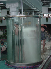 蘑茹泉 利用2M高之水柱,淋漓于宛如蘑菇型之不銹鋼物體上,人站于其下,直淋頭、頸、背部,可達(dá)按摩、舒暢、活絡(luò)筋骨、減輕疼痛之效。浮浴 利用池底涌出之強(qiáng)勁水柱上,宛如腳踩云端,可達(dá)腳底按摩、治療失眠、減輕高血壓之效果。全身放松,消除失眠癥、高血與情緒不安之癥狀。 八方淋浴 利用十顆特殊噴頭有四面八方噴出細(xì)微水分子,直打全身各部位,可刺激按摩穴道及活絡(luò)筋骨。