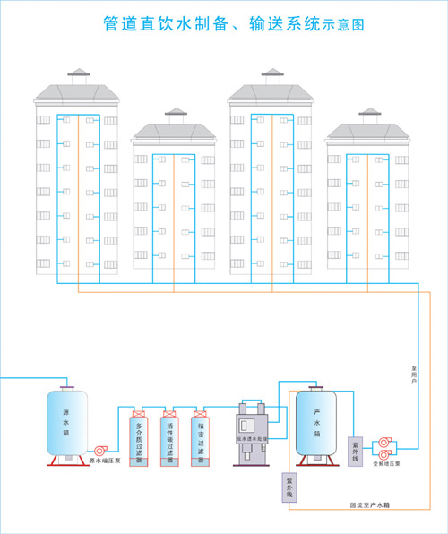 二、變頻恒壓供水設備在分質供水工程中采用全自動恒壓變頻供水裝置直接提升供水,衛生、安全、可靠,用戶隨時都能飲用新鮮水,避免了二次污染,且設備占地小、性能穩定、能耗低。 三、分質供水管網 分質供水管網為系統調試和管網維護提供了必要的條件。分質供水管網的設計不同于普通自來水管網的設計,其核心是:分質供水管網要使凈水循環流暢,盡可能不存在死角。循環流暢的意義在于管網中未被用戶使用的水必須能夠及時流動和經過管網消毒系統回流至凈水水箱,而不是在某段管道中長時間停留,否則極易造成管網二次污染、滋生細菌。 四、管網水循環消毒設備 管道分質供水必須做到“打開龍頭即能生飲”。除了要做到優質飲用水設備出口水質達標外,必須在管網上設置管網水定時循環消毒裝置這樣才能確保管網水的衛生安全,有效防止二次污染。 |